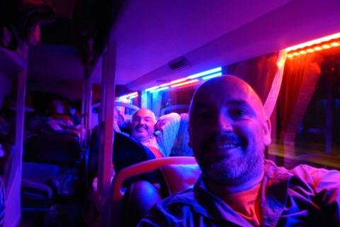 El autobús, muy reconocible por su iluminación psicodélica de leds azules, violetas y rojos, llegó después de casi media hora. Al subir el autobús los pasajeros recibieron una bolsa de plástico donde depositar los zapatos antes de acceder al interior.