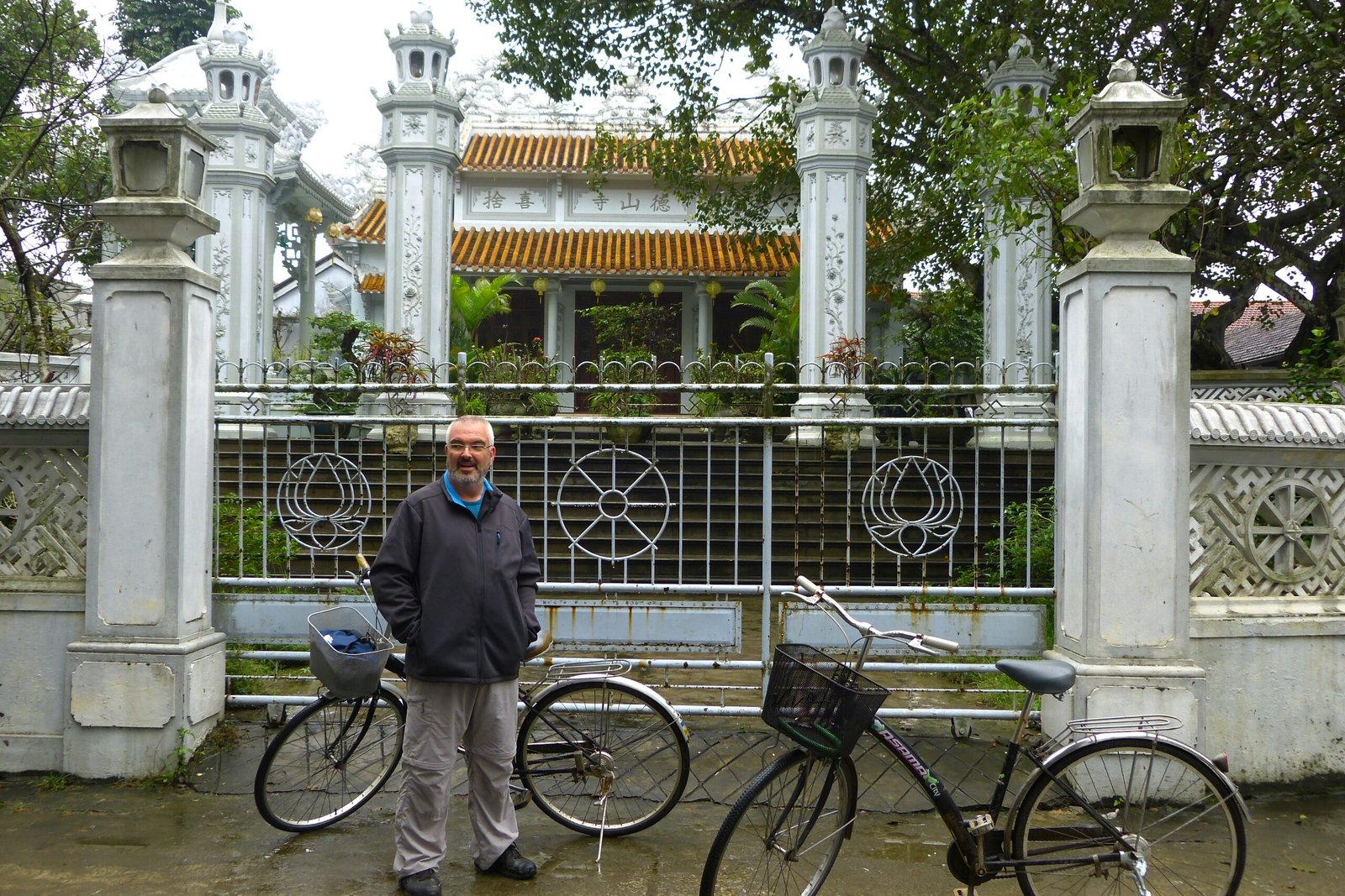 El segundo día de la estancia en Hué tocaba visitar unas tumbas, dispersas por una amplia zona a las afueras de la ciudad. Alquilar unas bicis era una buena opción para desplazarse, así que Edu y Carlos tomaron sendas bicis y se mezclaron en la jungla de motocicletas con sus pi pi piiii... Uno de los accesos a la zona era una amplia avenida, dos kilómetros de largo y toda en obras, pero increiblemente no estaba cortada al tráfico. Así que Edu y Carlos fueron esquivando retroescavadoras, camiones, apisonadoras, peatones, motos y otras bicicletas. El día estaba lluvioso lo que complicaba un pelin las cosas; la calle estaba llena de baches charcos. Primer destino fue la Explanada de Nam Gran, donde en epocas pasadas se realizaban rituales y ofrendas. No fue muy espectacular: una amplia plaza en tres niveles rodeada de verdes pinares, y poco más.