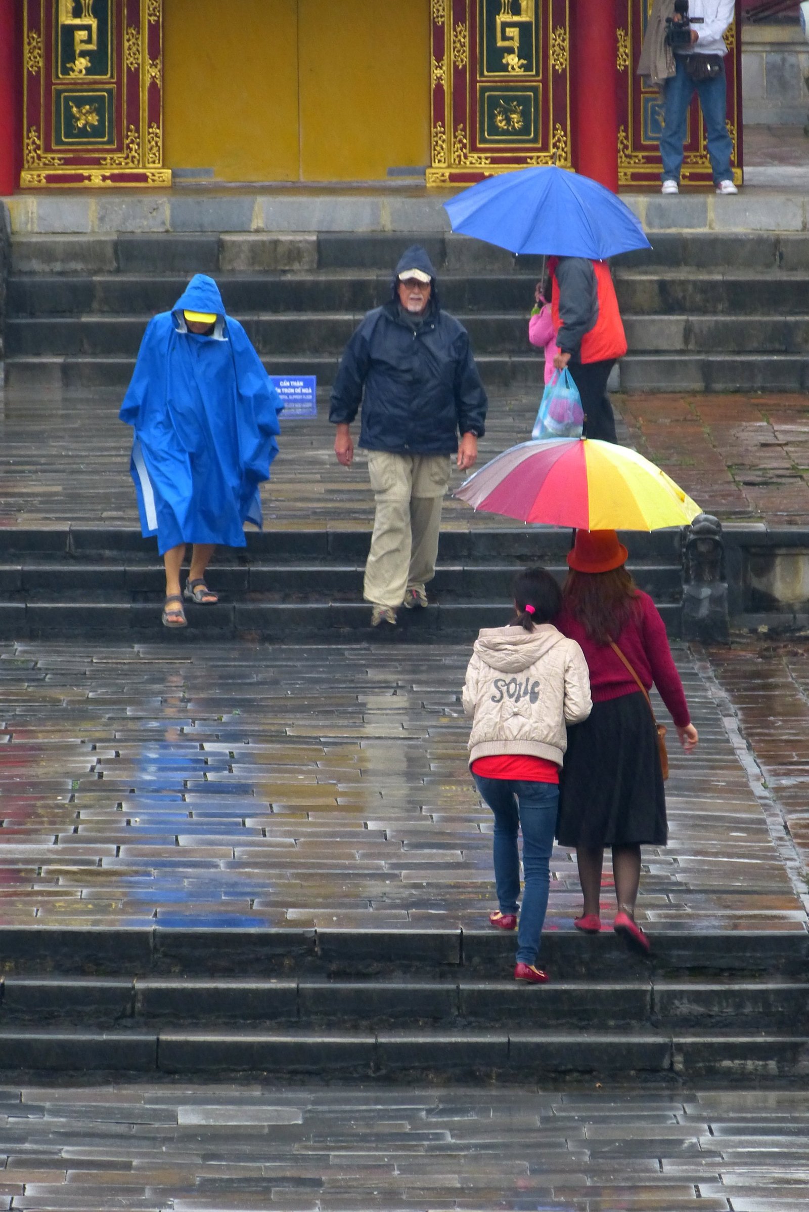 La guía también marcaba un lugar mas lejano: la tumba de Minh Mang. Había que tomar una carretera rural, así que Edu y Carlos siguieron su camino. La lluvia aumentaba... empapaba las chaquetas semi-impermeables de Edu y Carlos (eran las mismas que habían comprado en unos almacenes en España, meses antes, al igual que los zapatos. Pero los lugareños de los que siempre hay que aprender son mucho mas prácticos y usaban unos ponchos, con los que se cubrían ellos y las motos. Algunos tenían una especie de ventanita transparente para permitir pasar la luz de los faros nocturnos.