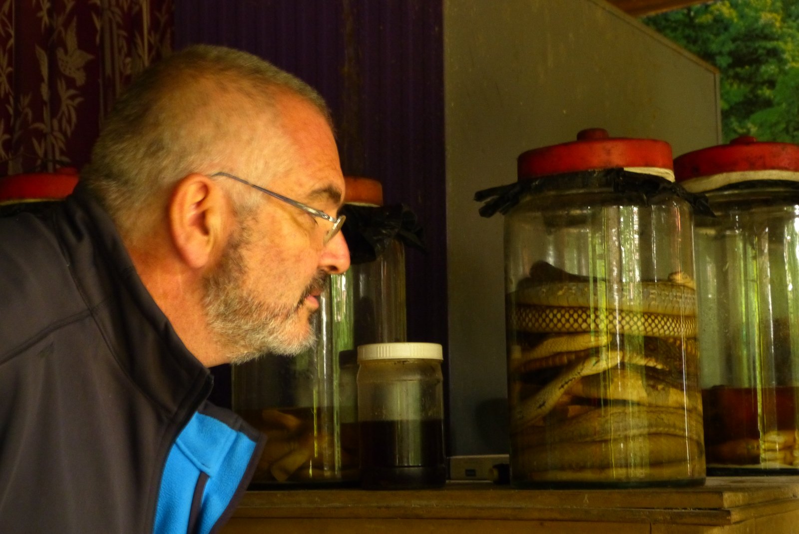 Una sopa caliente en el establecimiento les reconfortaría. Mientras la chica preparaba la sopa en la cocina, Carlos quedó fascinado por unos enormes frascos encima de un mostrador. El contenido de uno de ellos era un ave de plumaje oscuro, retorcido en en el frasco, sumergido en un liquido amarillento. Se apreciaban las patas y el pico. Al acercarse percibió un olor agrio. Otro de los frascos contenía un reptil, una especie de lagarto gigante. ¿Era uno o varios? La falta de luz impedía hacer una determinación. El siguiente contenía serpientes, también en el mismo liquido amarillo. Carlos observaba, le parecía que aquellas serpientes podrían tomar vida en cualquier momento. cuando la sopa llegó a la mesa, Carlos comentó, -espero que la sopa no lleve ninguno de esos ingredientes.