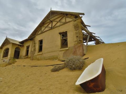 Lüderitz es una ciudad costera. Edu y Carlos pasaron allí la noche del 29 en un bonito enclave. El camping estaba en una pequeña península desde donde se podía contemplar el puerto. Muy cerca de Lüderitz está Kolmanskop, la ciudad fantasma. Edu y Carlos hicieron una excursión allí. La ciudad fue fundada por los alemanes alla por el año 1906 para la explotación de diamantes. Contaba con lujosas mansiones, tiendas, un teatro, bolera, bar, carniceria, panaderia, una fabrica de hielo, escuela, un hospital con más de cien camas, incluso un tranvía que funcionaba por traccion animal. Contaba también con un enorme depósito de agua salada que traían del mar mediante tuberías para fabricación del hielo y el lavado de los diamantes en el que también se daban algún que otro chapuzón a modo de piscina olímpica. El agua dulce se traía en barcos desde Ciudad de Cabo. Pero la arena del desierto reclaman su espacio original y las mansiones van cediendo en esa puja. En algunos de los edificios más conservados había rotulos en inglés rogando cerrar las puertas por la presencia de serpientes. Afortunadamente ni vieron ninguna pero sí el rastro de una que pasó recientemente por alli.