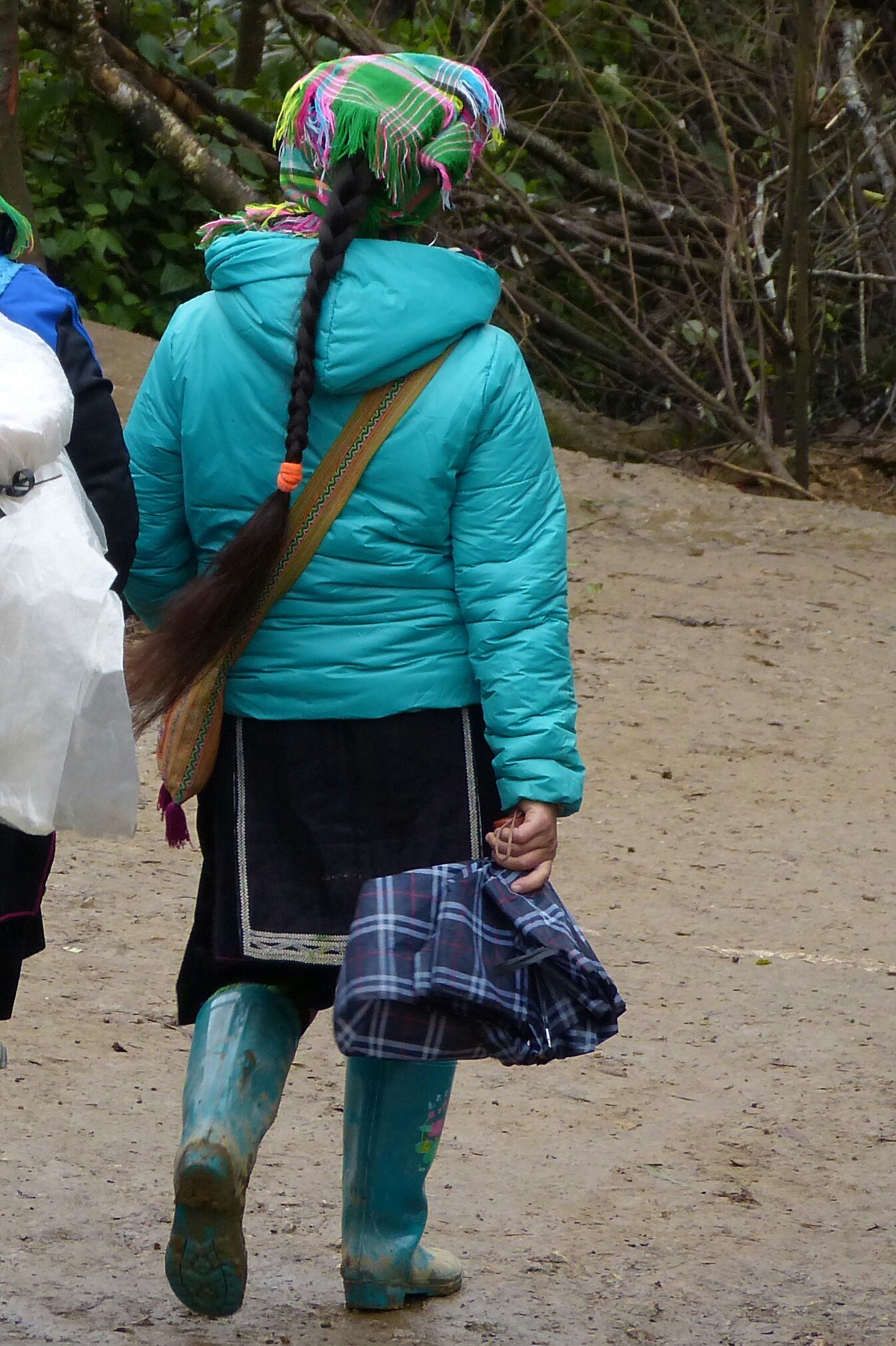 Pinh parecía timida, pero segura de lo que hacía. Serena, tranquila, muy sencilla y prudente. Una delicia de chiquilla. Nunca salió su entorni rural, tan solo en alguna ocasion muy contada a Lao Cai, la ciudad cercana a Sa Pa. Por eso conocía todos los caminos, todos los atajos. Hablaba poco de si misma pero respondía solícita a todo lo que se le preguntaba. El primer día no llevaba más equipaje que un paraguas y la botellita de agua. Por eso a Carlos el gesto de gastar parte de su agua en quitar el barro de sus manos le pareció algo encomiable. Caminaba de forma graciosa con sus botas catiuscas de color turquesa. Dando saltitos, parecía ejecutar pasos de danza en algunas ocasiones. En realidad se debía a que pisaba por huellas por donde habían pasado otros caminantes, o piedras y trozos de madera colocadas estrategicamente para sortear los pequeños arroyos.