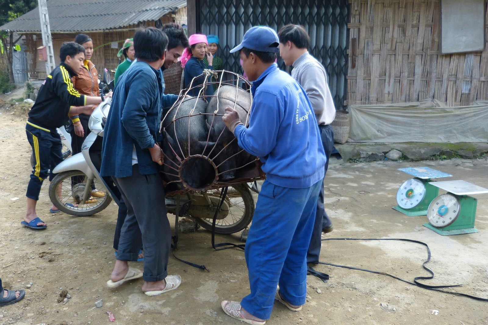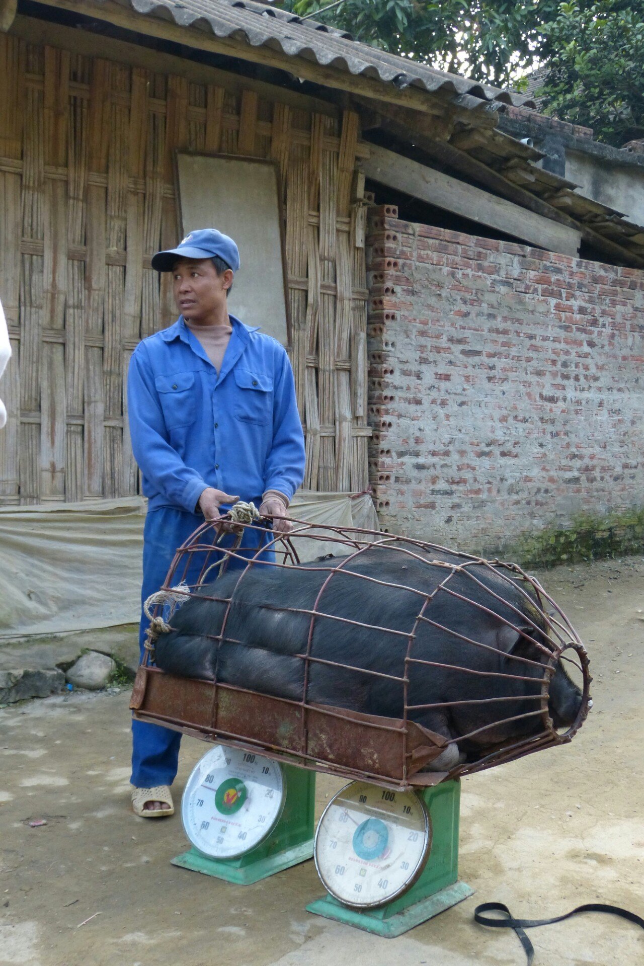 Una mujer acaba de vender dos cerdos, total 140 kilos por 7.000.000 Dong. Parece muy contenta con el trato. Luego el comprador sube los dos pobrecillos en su moto. cerdo mujer Viaje 2014 - Vietnam Añadir nuevo comentario